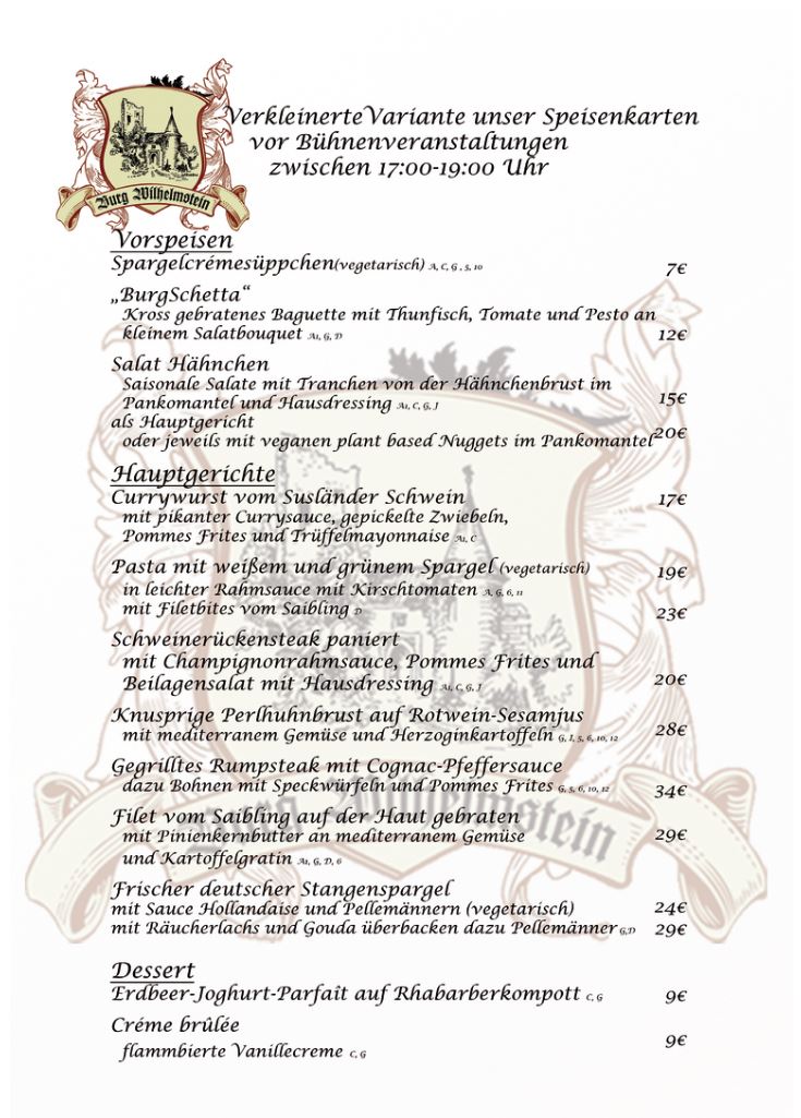 Um garantieren zu können, dass all unsere Gäste zu Veranstaltungsbeginn die Möglichkeit hatten lecker in unserem Haus gespeist zu haben, reichen wir zwischen 17:00-19:00 Uhr eine verkleinerte Variante unserer Speisenkarte.