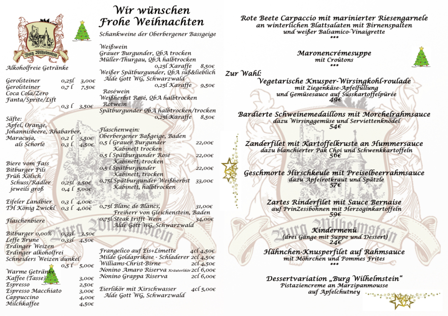 Wer also noch das Weihnachtsfest mit der Familie oder Freunden bei uns auf der Burg Wilhelmstein zelebrieren möchte sollte möglichst bald einen Tisch reservieren.